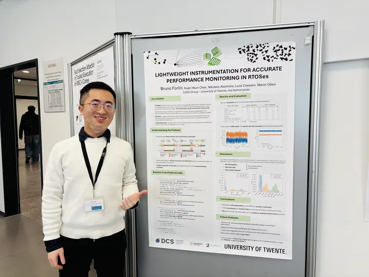 Representing CAES (Computer Architecture for Embedded Systems), I brought four posters covering RTOS instrumentation, neuromorphic computing, electric vehicle scheduling, and hardware security. The poster shown in the picture – “Lightweight Instrumentation for Accurate Performance Monitoring in RTOSes” – sparked particularly deep discussions. These conversations opened up several promising collaboration avenues, including: